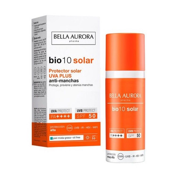 La principal causa de la aparición de manchas en la piel es debido a la incidencia de la radiación UV-A. Formulada con UVA defense technology y activos despigmentantes impiden la sobreproducción de melanina, corrige las hiperpigmentaciones y manchas existentes y previenen la aparición de nuevas. Además, ofrece protección frente las radiaciones UVB, IR, WIFI y luz azul ( dispositivos digitales, fluorescentes... ). En su formulación se han incorporado antioxidantes y activos reparadores que hacen de bio 10 solar UVA plus, una protección 360 para tu piel. Con aceite vegetal orgánico, un super-emoliente que calma e hidrata la piel preservando la elasticidad de ésta, no deja sensación grasa ni brillos. Protección SPF50+ Protección UVA + UVB + Luz visible (HEV) + Infrarrojos (IR). Resistente al agua. Testado bajo control dermatológico. Hipoalergénico.