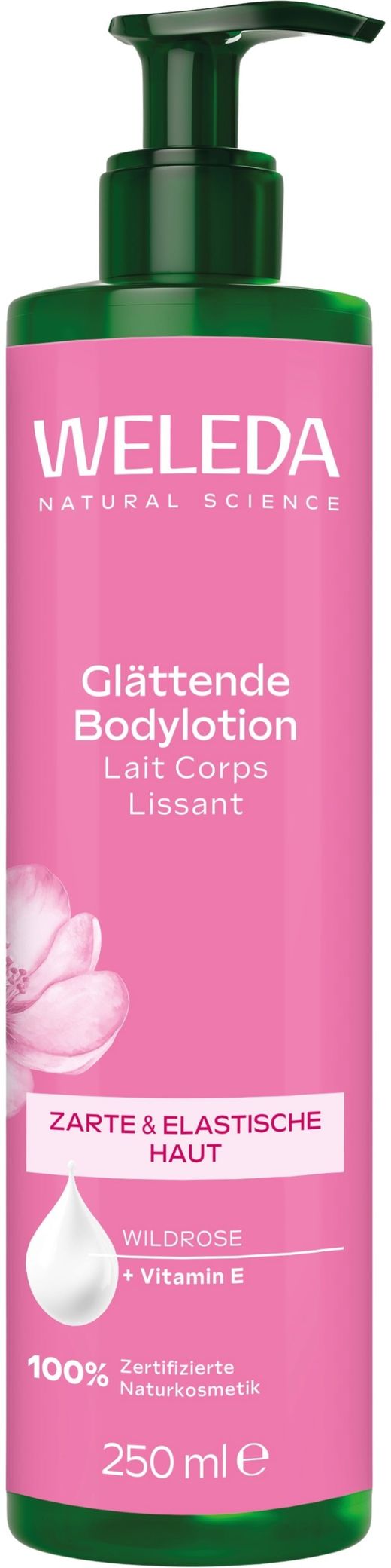Leche corporal de rosa mosqueta silvestre y vitamina E vegetal. Nutre y suaviza la piel seca, estimula la actividad celular de la piel, mejora su elasticidad y proporciona una hidratación de larga duración con una textura sedosa.